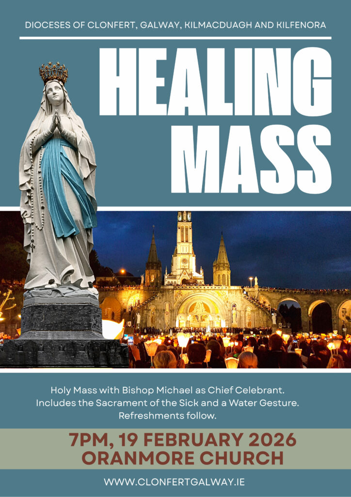 To mark the Feast of Our Lady of Lourdes, all are invited to a Healing Mass with Bishop Michael in Oranmore Church at 7pm on 19 February 2026. We gather in prayer for those carrying illness in body, mind, or spirit, seeking grace through the intercession of the Blessed Virgin Mary. The Sacrament of the Sick and a Water Gesture will be offered. Refreshments follow and all are welcomed.