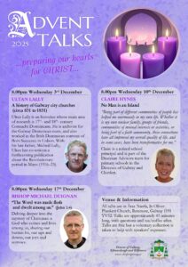 Advent talks will take place on Wednesday 3rd of December, 10th of December and 17th of December at 8.00pm.