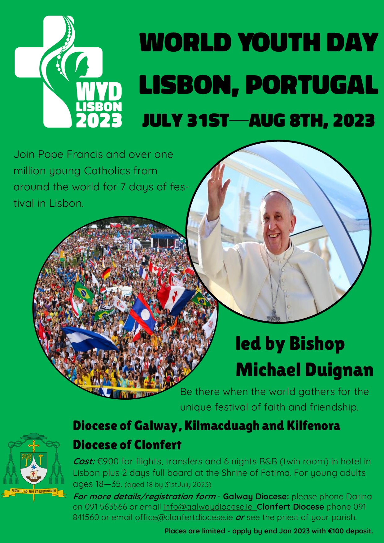 WORLD YOUTH DAY GATHERING WITH POPE FRANCIS 2023 in LISBON and FATIMA from July 31st – August 8th, 2023.Spiritual Director – Bishop Michael Duignan. OPEN TO ADULTS BETWEEN THE AGES OF 18 (by 31st July 2023) AND 35. Subsidised Fare €900. For further information and booking form contact Isabelle at the Clonfert Diocesan Office – Tel. 91 841560 Email. office@staging.clonfertgalway.actondev9.com or your local priest. Limited places available. Bookings close 31st January 2023. Be there when the world gathers for the unique festival of faith and friendship!